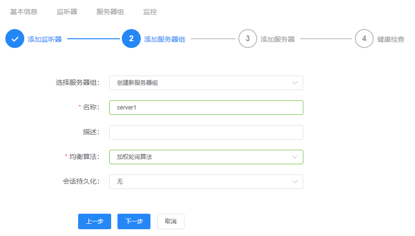 均衡算法 | 选择服务器组使用的均衡算法。包括轮询算法、最小连接算法、源地址算法。各算法的说明请参考“负载均衡算法”。 |