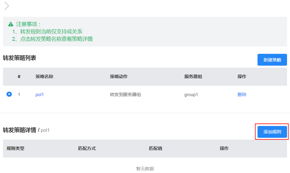 在转发策略列表中,单击转发策略名称,在转发策略详情右侧,单击“添加规则”。