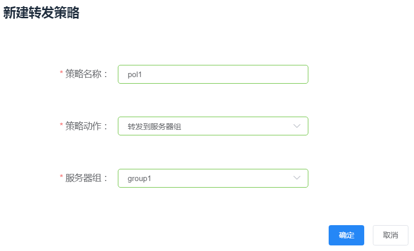 在新建转发策略窗口配置策略名称和策略动作,单击“确定”。