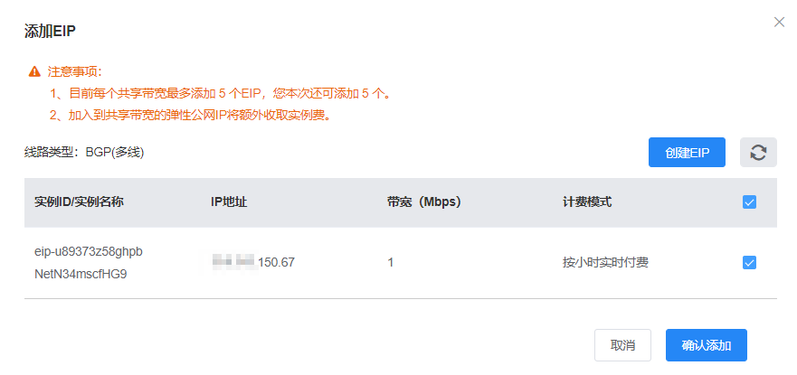 在“添加EIP”窗口,勾选需添加的弹性公网IP,单击“确认添加”。