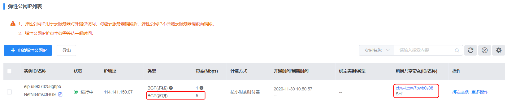在弹性公网IP列表页面,也可以看到弹性公网IP已加入到共享带宽中。