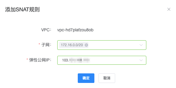 在添加SNAT规则窗口,选择子网、弹性公网IP,单击“确定”。