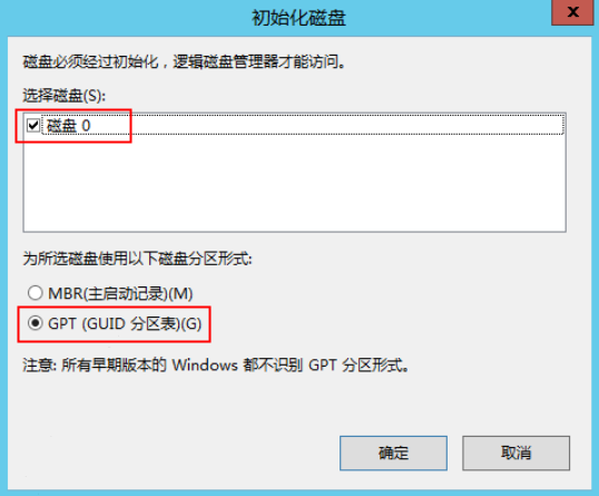 在“初始化磁盘”对话框中,选择磁盘分区形式为GPT,单击“确定”。