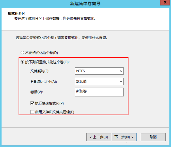 进入“格式化分区”页面。系统默认的文件系统格式为NTFS,请根据实际需求设置其它参数,并单击“下一步”。