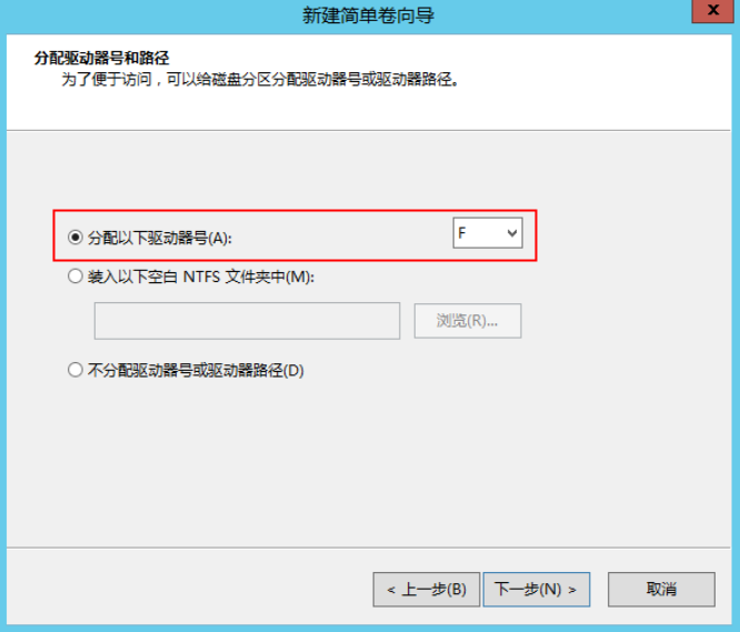 系统默认选择分配驱动器号“F”。此处以默认值为例。