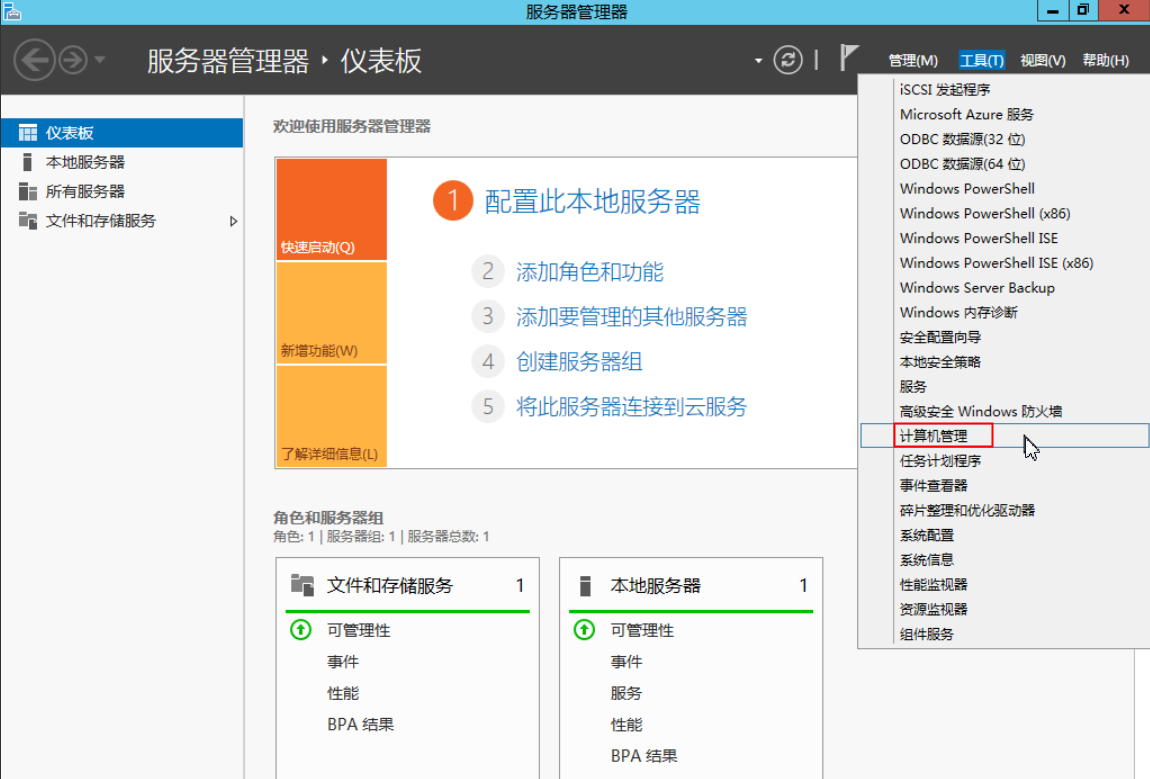 在“服务器管理器”页面右上方选择“工具 > 计算机管理”。