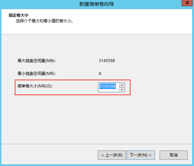 进入“指定卷大小”页面,输入简单卷大小,单击“下一步”。