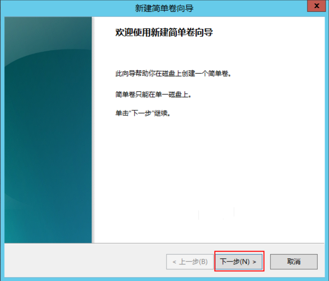弹出“新建简单卷向导”窗口,根据界面提示,单击“下一步”。