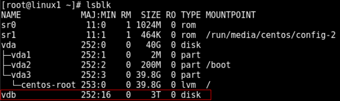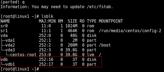 回显信息如下,此时可看到新分区“/dev/vdb1”。