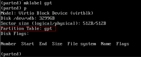 回显信息如下。“Partition Table: gpt”表示磁盘分区形式为GPT。