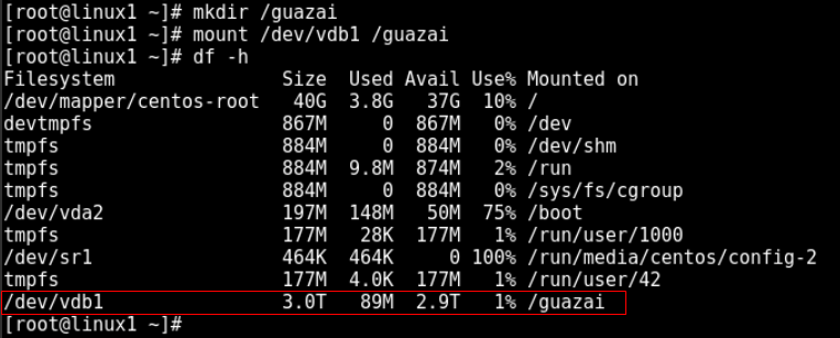 例如,将新建分区“/dev/vdb1”挂载至挂载点“/guazai”: