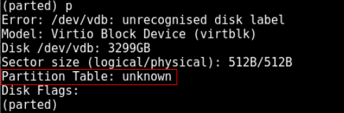 回显信息如下。“Partition Table: unknown”表示磁盘分区形式未知,新的数据盘还未设置分区形式。
