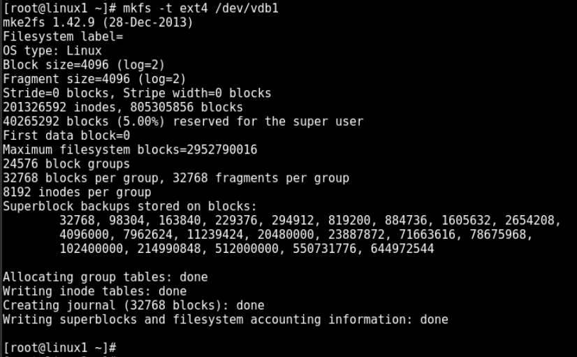 (3) 执行mkfs -t ext4 /dev/vdb1命令。