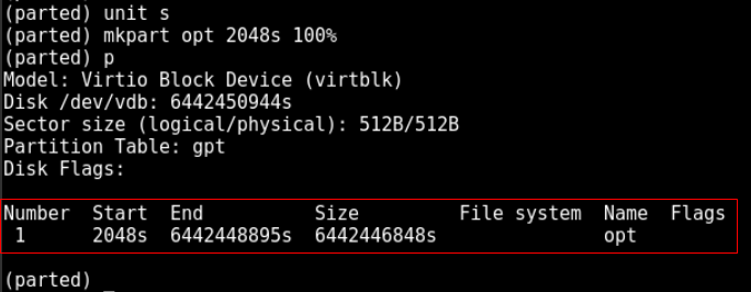 回显信息如下,表示新建分区/dev/vdb1的详细信息。