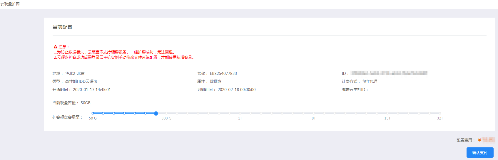 在云硬盘扩容页面,选择要扩容的容量,单击“确认支付”。