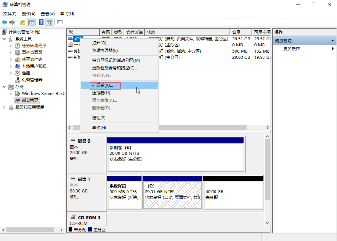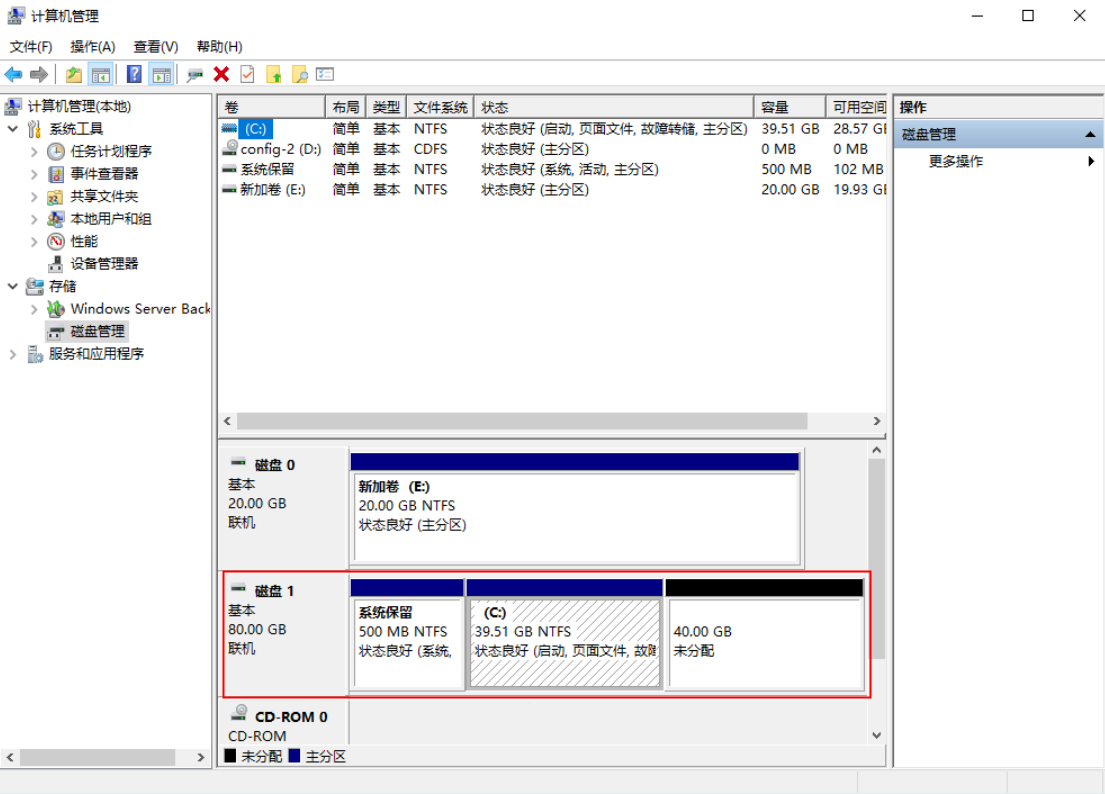 本文中以Windows Server 2016 Standard 64位中文版操作系统为例进行介绍,扩容系统盘容量,原有容量为40GB,扩容后容量为80GB。
