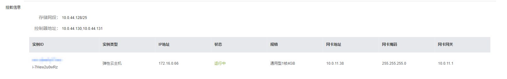 可以在“挂载信息”中看到iSCSI共享卷的“存储网段”、“控制器地址”,以及所挂载实例的网卡地址、网卡掩码、网卡网关等信息。