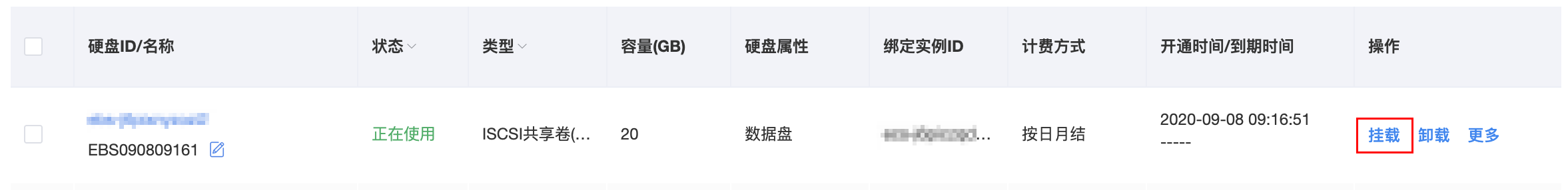 在云硬盘列表页面,单击待挂载iSCSI共享卷后操作列的“挂载”。