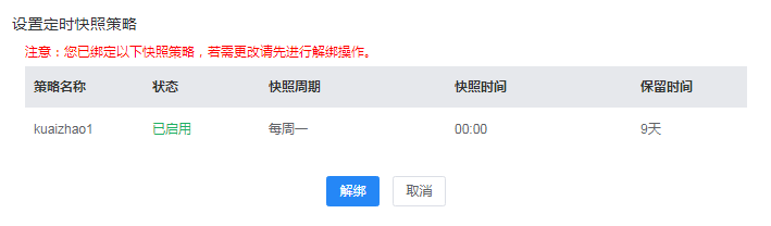 如果需要停止对某个硬盘进行定时快照,可以通过“解绑”功能,将定时快照与硬盘解绑。