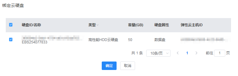 在绑定云硬盘弹窗中,勾选一个或多个硬盘,单击“确定”,绑定硬盘成功。