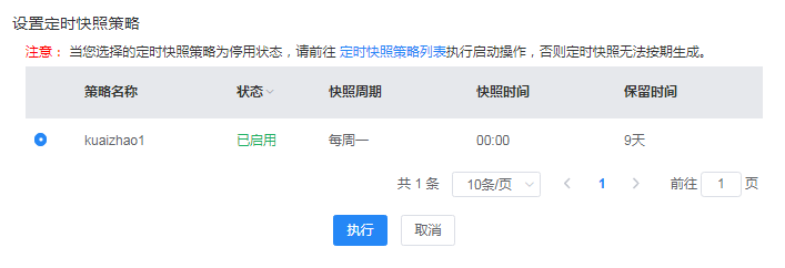 在设置定时快照策略弹窗中,选择需绑定的定时快照策略,并单击“执行”。