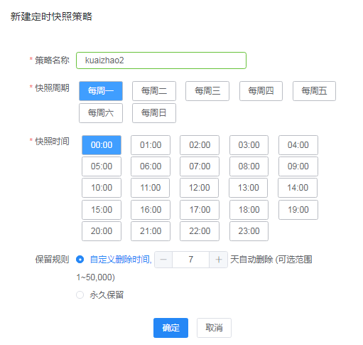 在新建定时快照策略弹窗中,正确输入策略名称,选择快照周期、快照时间和保留规则。