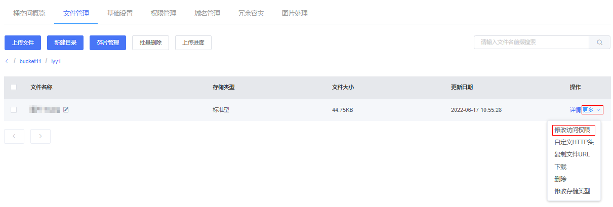 文件访问权限包括私有和公共读。上传文件后,可以修改文件的访问权限。