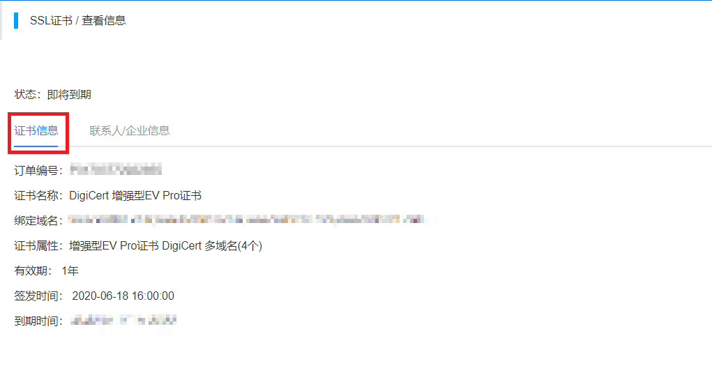 选择“证书信息”页签,可查看订单编号、证书名称、绑定域名、证书属性及有效期信息。