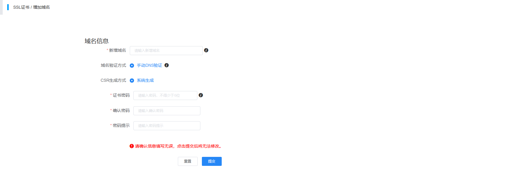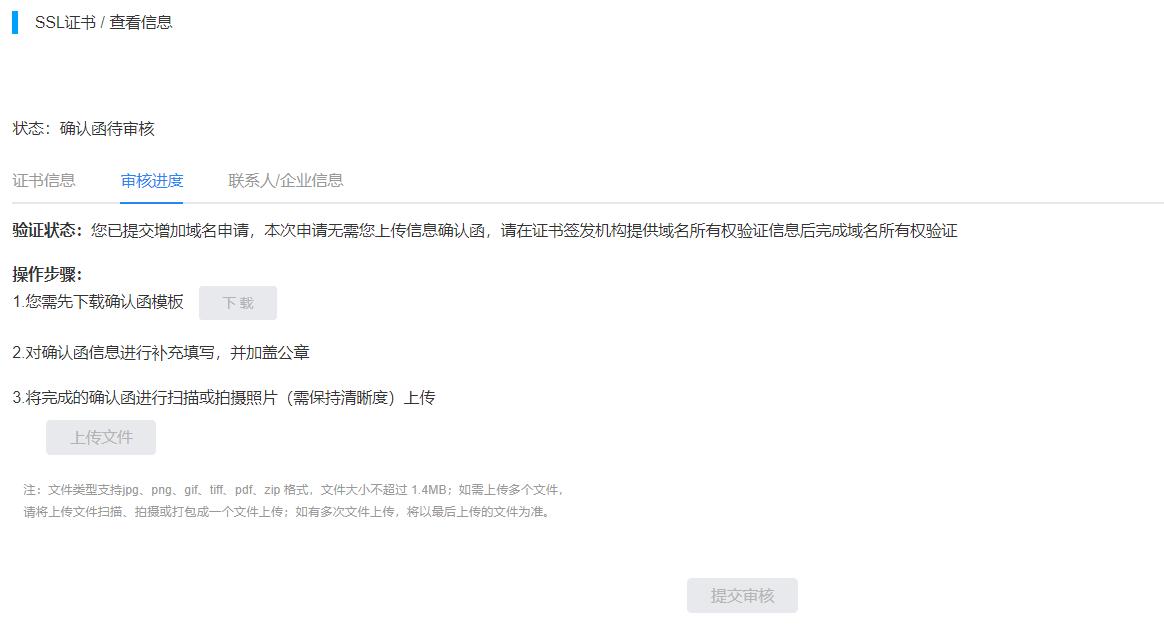 进行增加域名操作时无需您再次上传信息确认函,您需等待证书签发机构提供域名所有权验证信息。