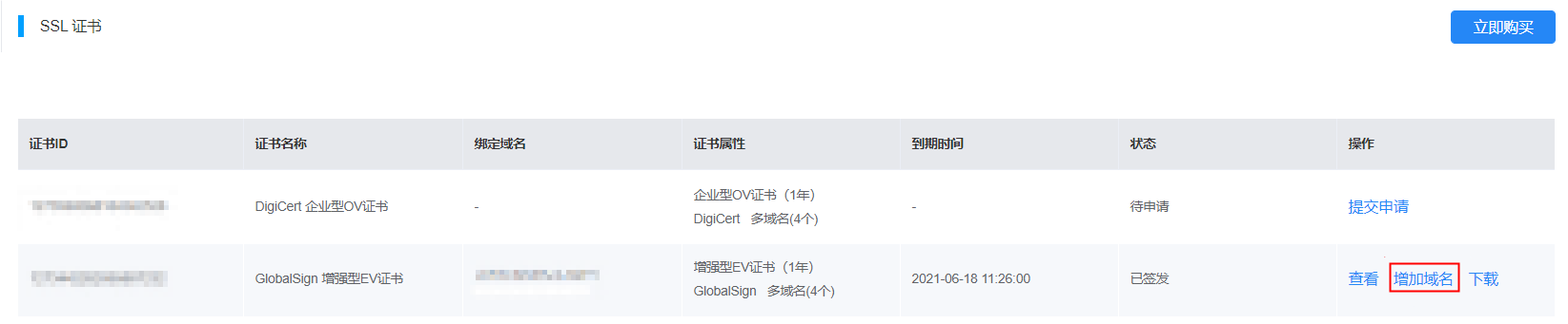 已签发的多域名证书,已绑定域名数量小于订单中选择域名数量时,可增加需绑定的域名(到期前30天内无法再增加域名)。