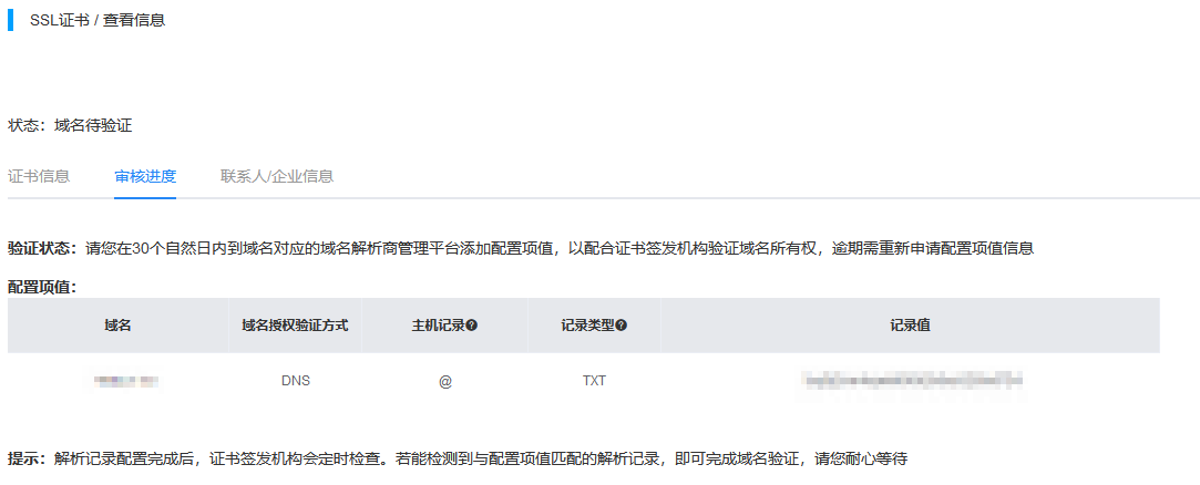 解析记录配置完成后,证书签发机构会定时检查。若能检测到与配置项值匹配的解析记录,即可完成域名验证,请您耐心等待。