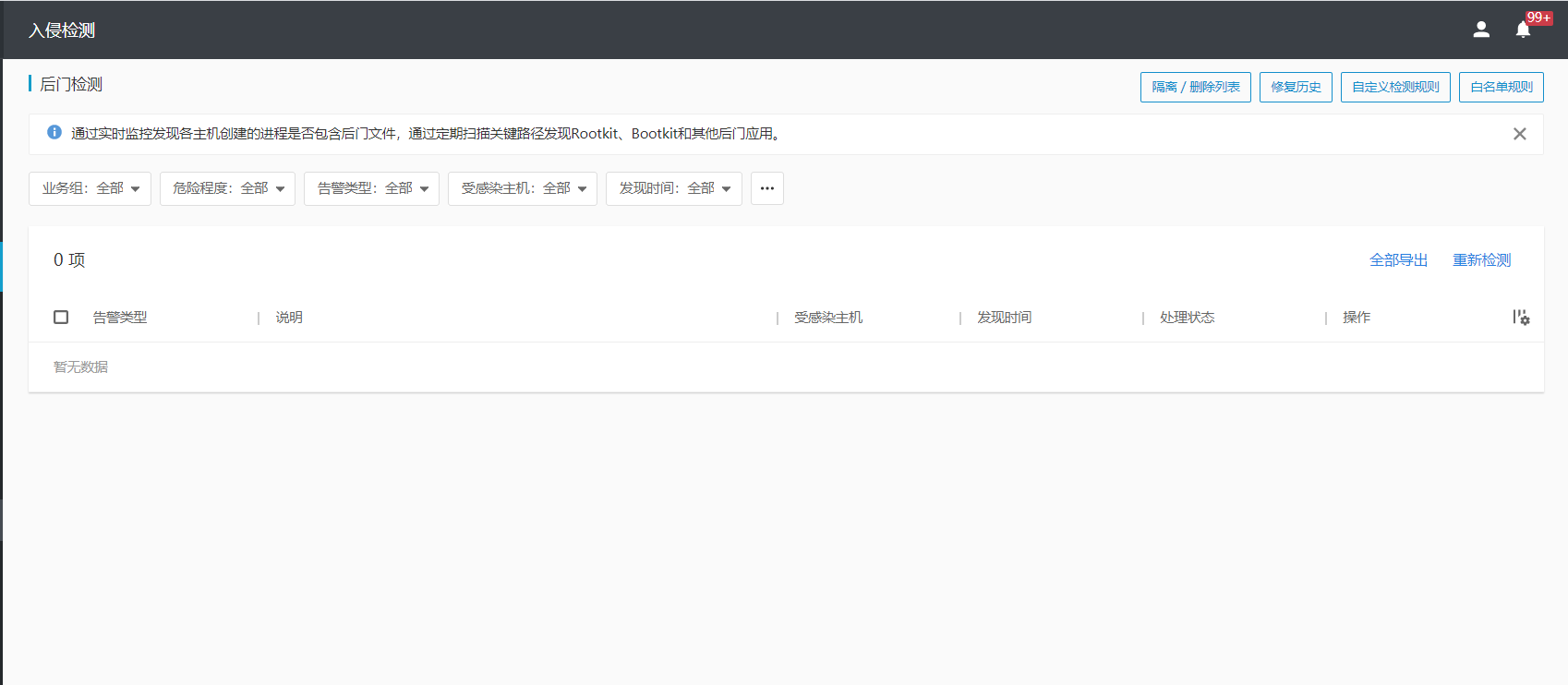 后门检测功能用于检测系统是否存在 Booitkit、Rootkit、应用后门、病毒木马等问题。云端+客户端的双重检测模式,让后门的每一个特征和行为,都会被实时发现或者通过扫描进行上报告警,同时给出专业角度的安全分析。不仅支持对后门进行隔离、删除、修复验证等多种处理方式,同时也提供检测规则的高度自定义能力,方便用户对挖矿木马进行快速响应和预防。功能实现了从监控发现、检测分析、响应处理、设置预防的安全闭环能力,为用户提供稳定持续高效的安全服务。