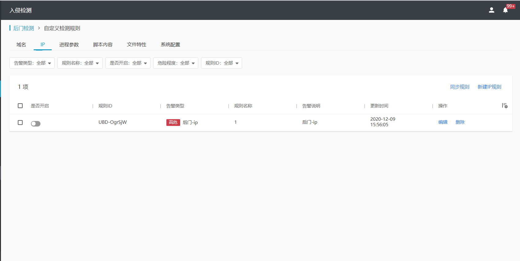 可管理已建立的自定义规则,对规则进行新建、编辑、删除、启用/禁用、同步更新等操作,方便用户灵活配置需要检测的后门。系统有内置的检测规则,即便不建立任何自定义规则,依然会有内置规则在进行持续的监测。