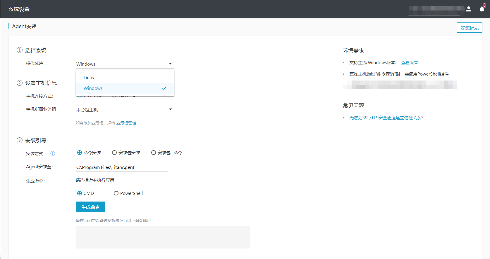 需下载安装包,输入安装包所在位置和Agent安装到的目录位置(默认为:C:\Program Files\TitanAgent),才可生成安装命令;生成命令后,在cmd中以管理员权限运行命令,即可安装Agent