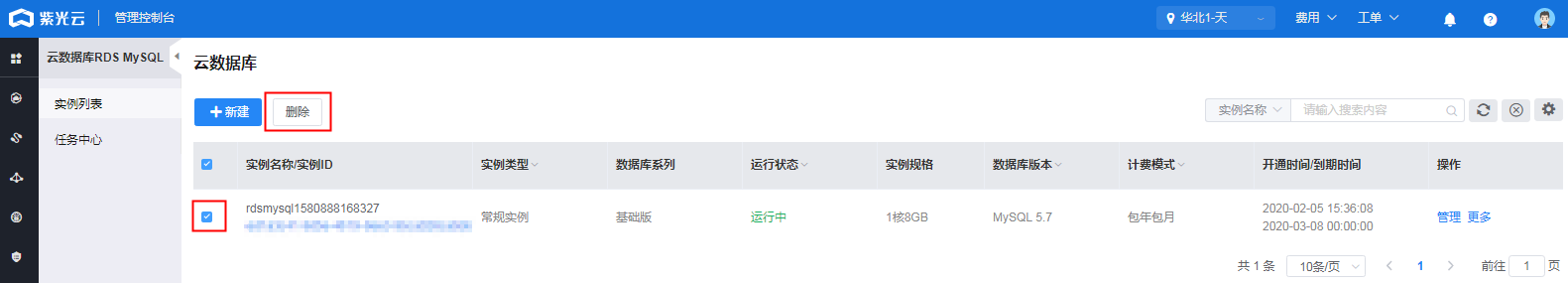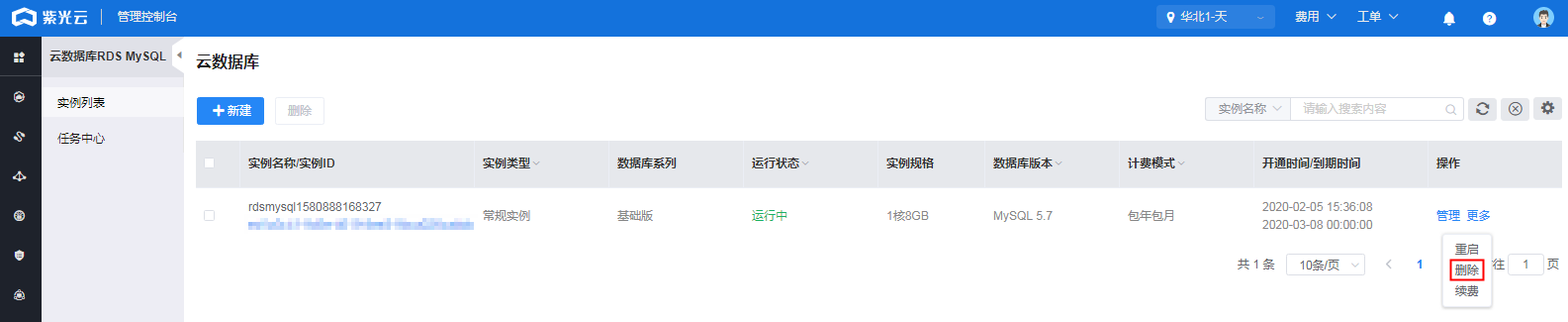 方法一:单击待删除实例后面的“更多”,选择“删除”。