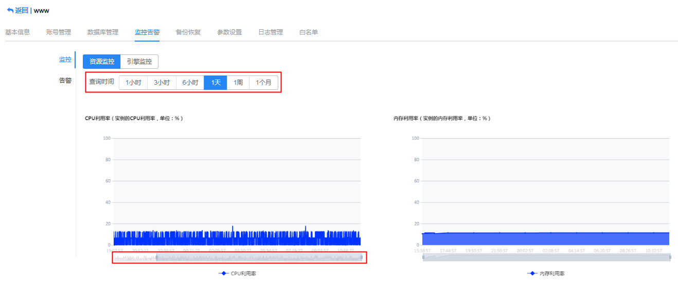 选择查询的时间区间,即可查看资源监控的数据。拖动监控项下方的时间轴,可以查看指定时间区间内的数据。