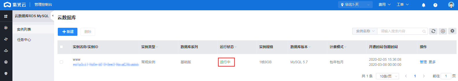 在实例列表界面,单击实例ID,或者单击实例后的“管理”。