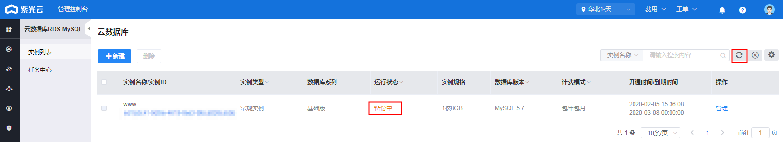 配置完毕后,返回到实例列表,查看实例的运行状态为“备份中”。可单击页面右上方的刷新运行状态。