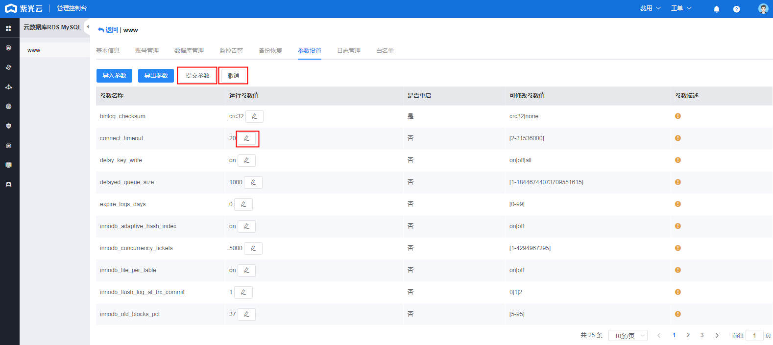 ○ 如果被修改的参数需要重启实例,提交参数并修改完成后,请重启实例。重启实例的方法请参见“重启实例”。