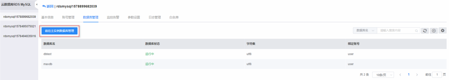 只读实例没有独立的数据库管理功能,只读实例上的数据库都是从主实例同步过来的,如果需要管理数据库信息,需要点击“前往主实例数据库管理”按钮,在主实例进行操作。