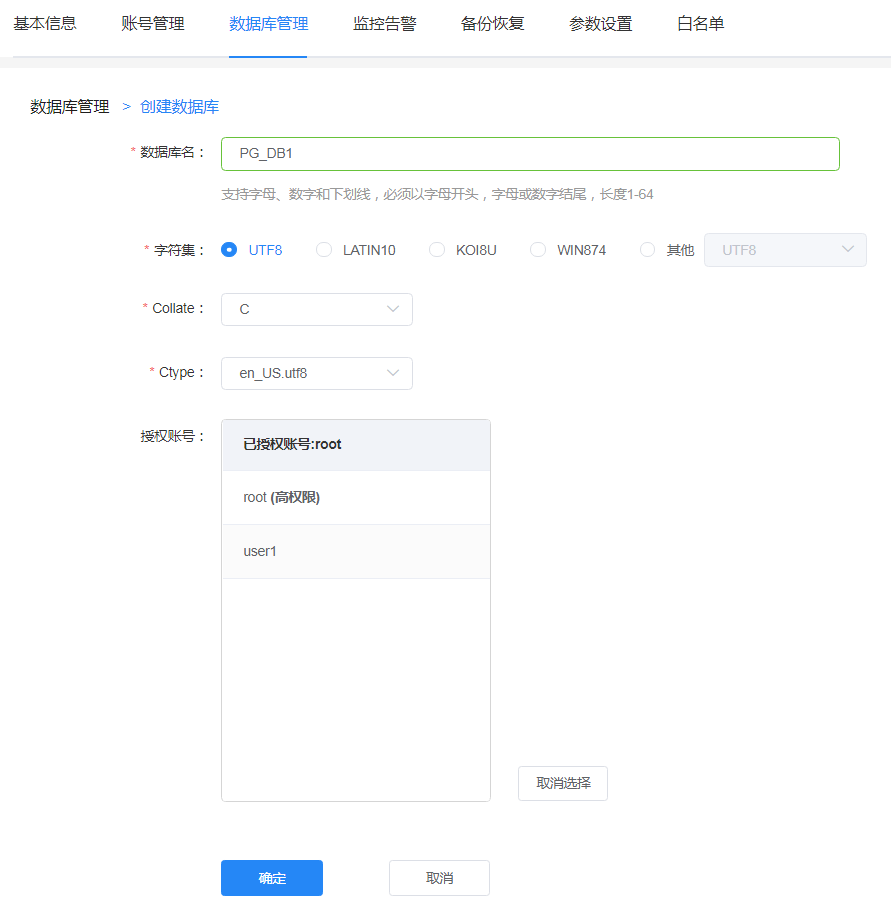 在创建数据库页面,按要求输入数据库名称、选择字符集、Collate、Ctype、选择授权账号单击“确定”。