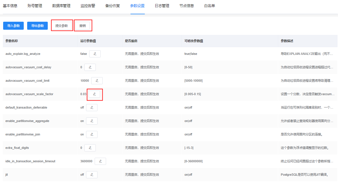 如果参数修改后需要重启实例,请在提交参数并修改完成后,重启实例。重启实例的方法请参见“实例”中的“重启数据库实例”。