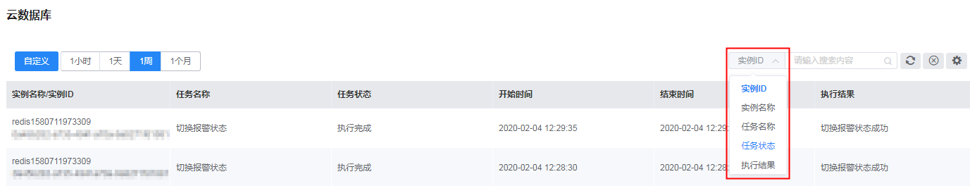 按类型查询日志:在任务中心页面,在下拉列表中选择分类(实例名称、实例ID、任务名称、任务状态和执行结果),输入搜索内容进行查询。