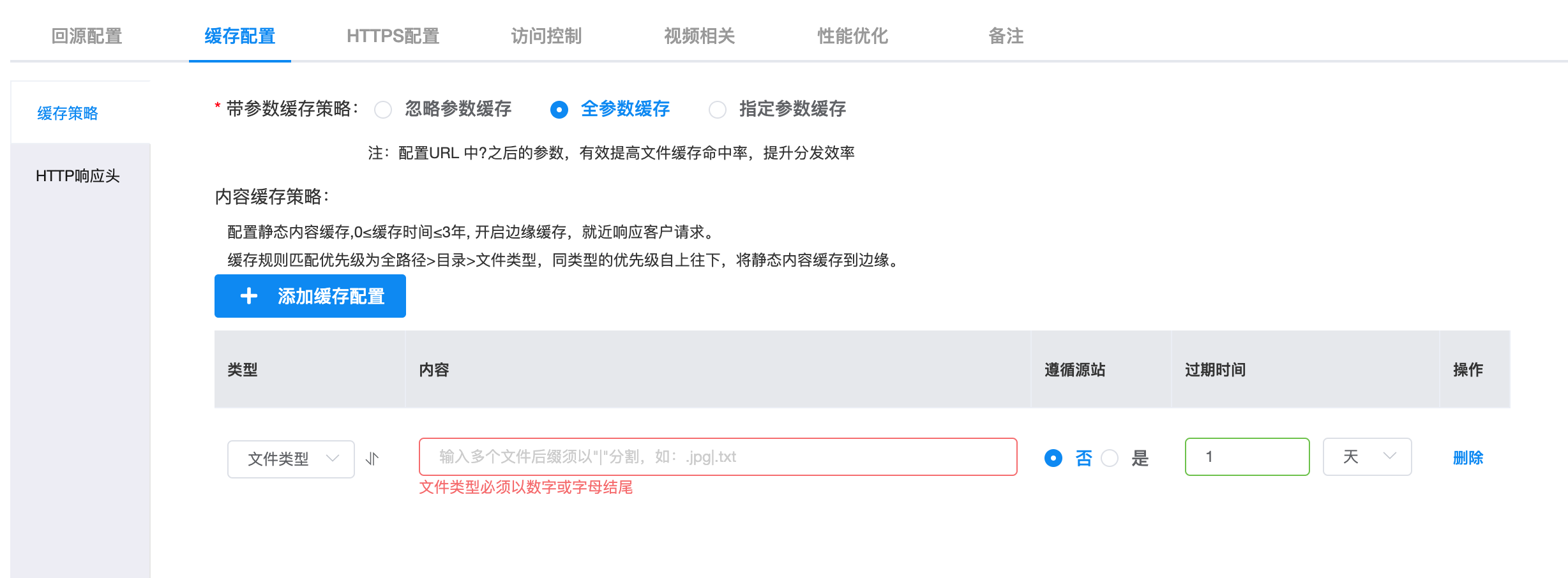 配置内容缓存策略,可点击“+添加缓存配置”自定义缓存规则。通过上下拖动可以调整缓存规则的优先级。