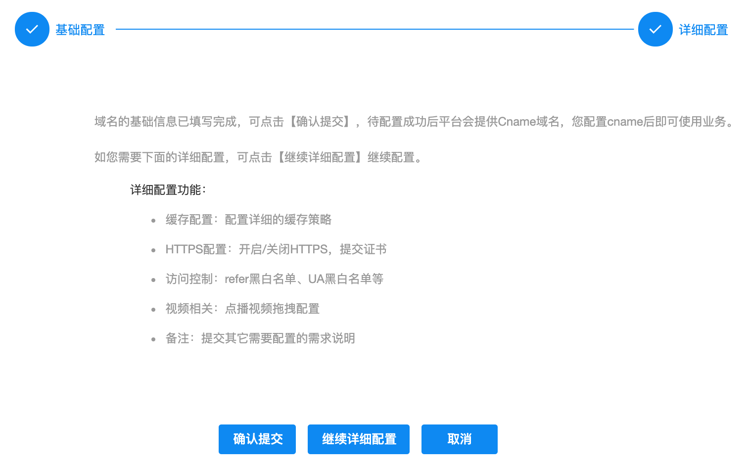 若点击【确认提交】,则会直接提交基础配置,平台根据基础配置信息部署业务。若点击【继续详细配置】则可配置以下信息,提交完成,全站加速平台将更加详细信息做配置。
