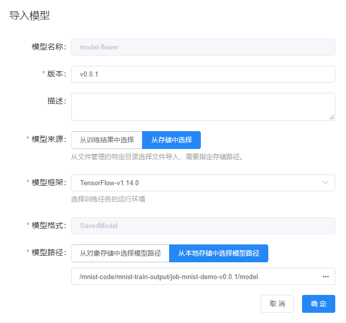 模型路径:从本地存储中选择模型路径:/mnist-code/mnist-train-output/job-mnist-demo-v0.0.1/model(本示例中将训练任务产出的模型导入模型管理)