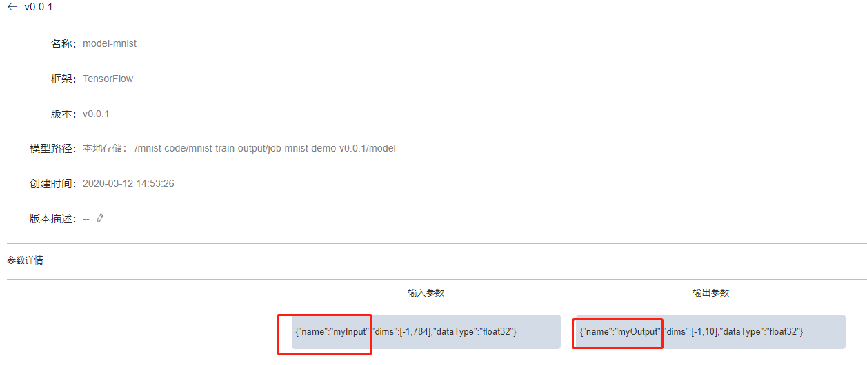 模型导入成功后,在模型某个版本的详情页中,可以看到模型的输入输出参数解析。