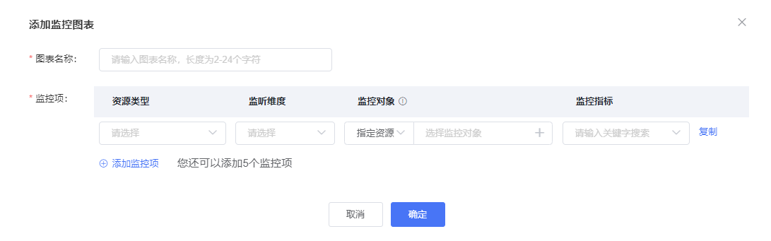 在添加监控图表弹窗,输入图表名称,并在下拉列表中选择监控资源类型、监控对象和监控指标。