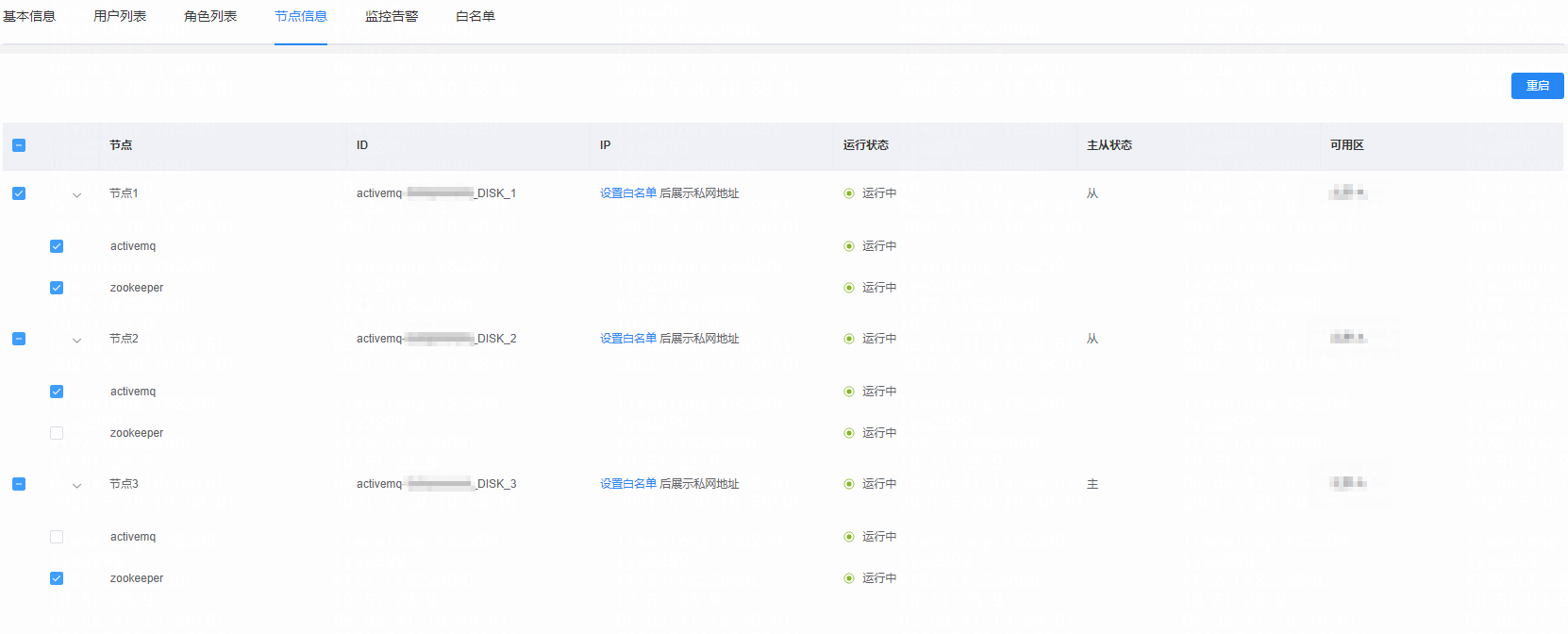 在重启节点页面,高可用版实例您可以选择集群中单个节点的ActiveMQ和Zookeeper进行重启,或选择多个节点的ActiveMQ或Zookeeper进行批量重启。重启节点可能会造成数据丢失,请谨慎操作。