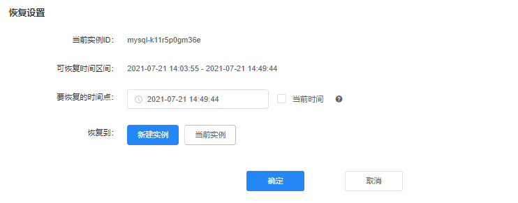 在“恢复设置”窗口,选择要恢复的时间点、恢复到新建实例还是当前实例。